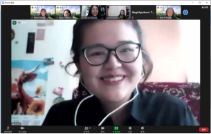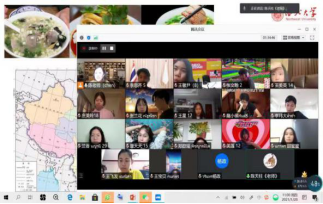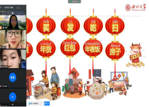 同时,汉语教学团队还配合“穿越古今”主题设计了汉语学习课程,制作了图文并茂的课件,通过视频会议软件开启云端直播的汉语课堂,让这些身在海外的营员也能在中国老师的指导下学习汉语,用所学汉语与中国人直接对话。
