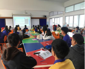 泰国清莱团结中学的同学在教室集体参加开营仪式、观看视频文化课