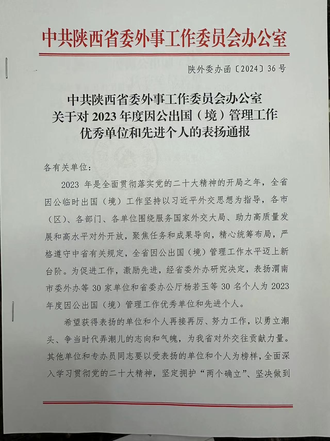 近日,中共陕西省委外事工作委员会办公室下发了《关于对2023年度因公出国(境)管理工作优秀单位和先进个人的表扬通报》,对2023年度因公出国(境)管理工作30家优秀单位和30名先进个人进行了通报表彰。