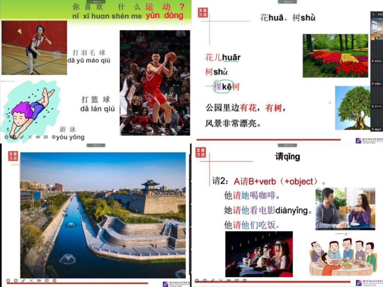 mjm世界杯官网汉语文化教师团队以游览西安名胜古迹为线索,精心设计了以“游学长安”为主题的汉语听说系列课程,采用视频会议软件小班互动式直播授课的方式,让营员们在“云游”中学习汉语。课堂中,汉语教师们努力为线上学习的营员们创造汉语对话情境,尽量设计了贴近日常生活的主题,设置营员们感兴趣的当下中国流行文化的场景用语。
