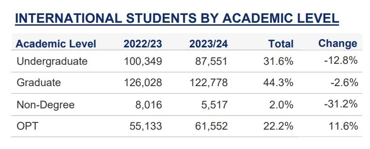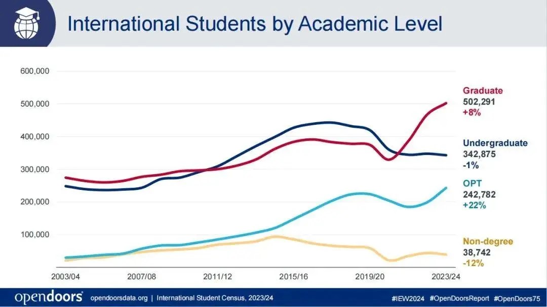 其中,研究生及OPT成为留美增长点!美国国际研究生人数在23/24学年达到502,291人,同比增长8%,创历史新高;参与OPT项目的国际员工数也达到242,782人,同比增长22%,同样创下新高;而本科生人数相对稳定,为342,875人,比去年还下降了1%。