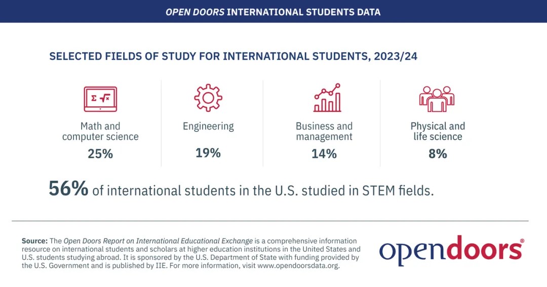 赴美职工在专业选择上,STEM方向热度仍然不减,有超过一半(56%)的国际生选择了STEM专业。