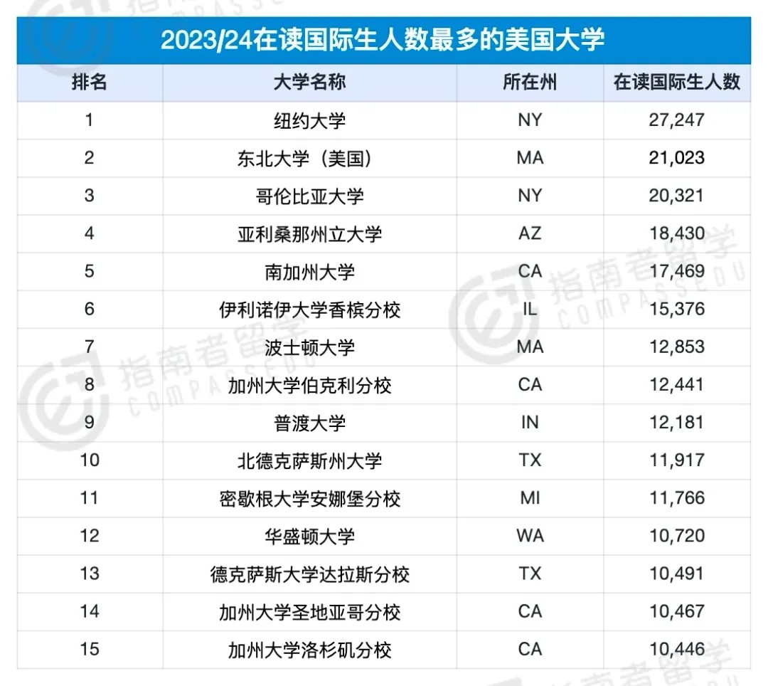 除此之外,指南君还给大家整理了美国开放门户公布的2023/2024国际生人数最多的大学。