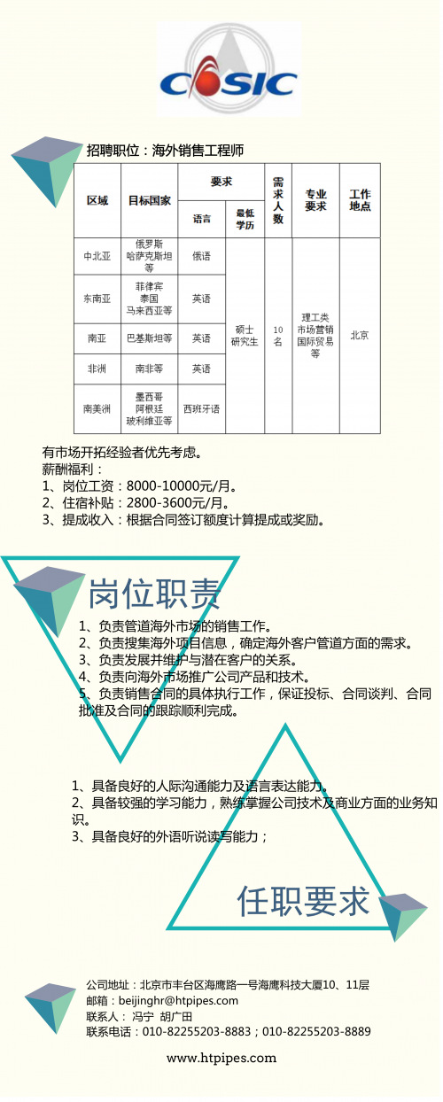 中国航天华创天元实业发展有限责任公司招聘简章 华创天元公司是由中国航天科工集团、中国航天科工集团第三研究院、航天科工海鹰集团三方投资,于1997年12月在廊坊开发区注册成立的公司,目前注册资本47500万元,经济规模已超过10亿元。 公司主要生产经营钢骨架聚乙烯塑料复合管及管件、钢带增强聚乙烯(PE)螺旋波纹管和多重增强钢塑复合压力管及管配件。目前,公司以廊坊生产基地为中心,以新疆、江苏、长春三个控股公司为外延,辅...