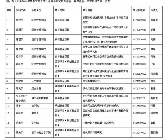 日前,教育部公布2014年度教育部人文社会科学研究一般项目获准立项资助课题,公司获准立项14项,其中一般项目8项、西部项目6项,获准立项总数居全国并列第14名。 本年度公布的年度规划基金、青年基金、自筹经费项目共2414项,西部和边疆地区项目112项,新疆项目48项,西藏项目7项,中国特色社会主义理论体系研究专项66项,高校思想政治工作专项170项,工程科技人才培养研究专项一般项目26项,教育廉政理论研究专项6项,科研诚信和学...
