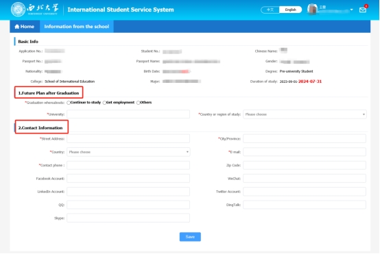 3、填写"毕业去向""Future Plan after Graduation"以及"永久联系方式""Contact Information"。填写完成后,点击"保存""Save"。